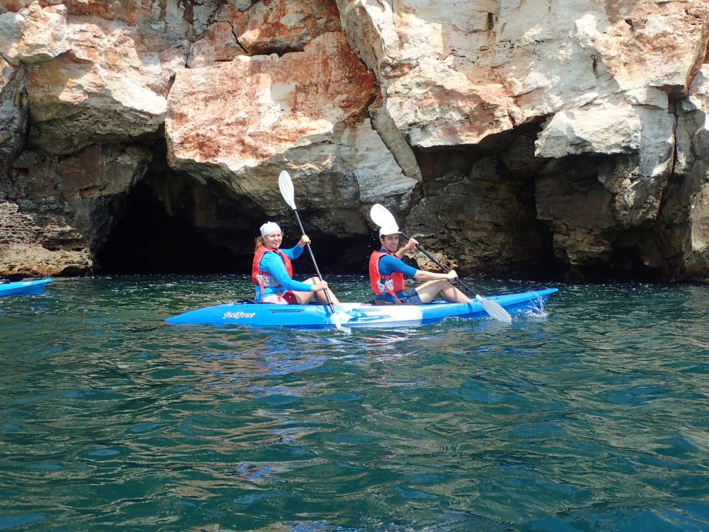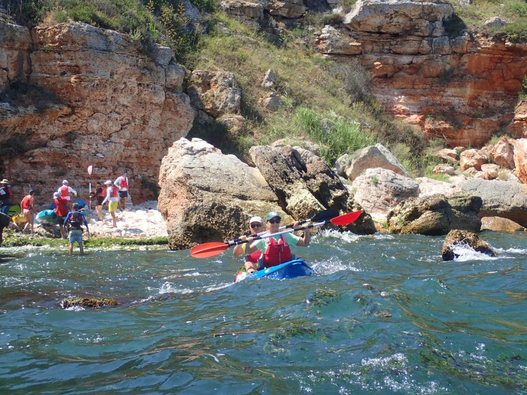 A doua parte a zilei: traseu de caiac de-a lungul falezei stâncoase. Vâslești pe mare, vizitezi grote maritime din caiac, te oprești pentru baie în locuri la care nu ajungi de pe uscat. Falezele, apa limpede și grotele creează un peisaj care nu seamănă cu nimic de pe litoralul românesc.